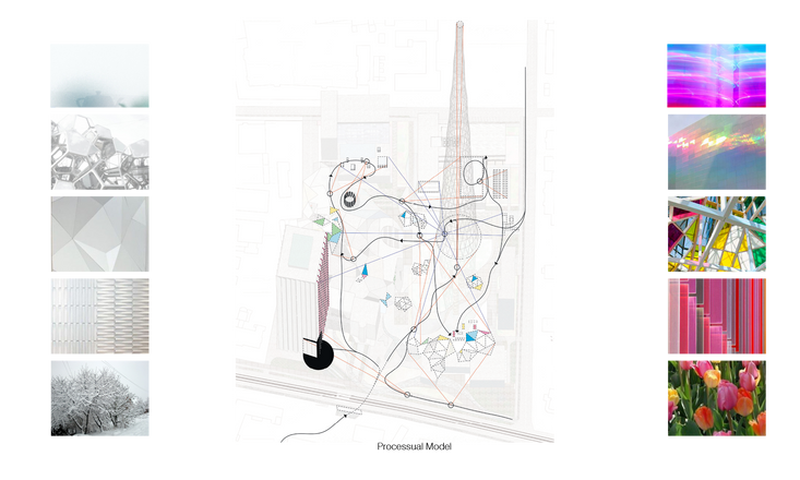 We want to be able to perceive Shuhov Tower through the eyes of the most famous avant-garde photographer and artist, Aleksandr Rodchenko. The architecture becomes the backdrop for the tower like the sky in Rodchenko’s images. Along the path, the tower stands alone and the architecture is muted. Looking back, the buildings become alive with color. We preserve the brick building from the 18th century and renovate the twelve story TV company building which has been suspended in construction since 2000.